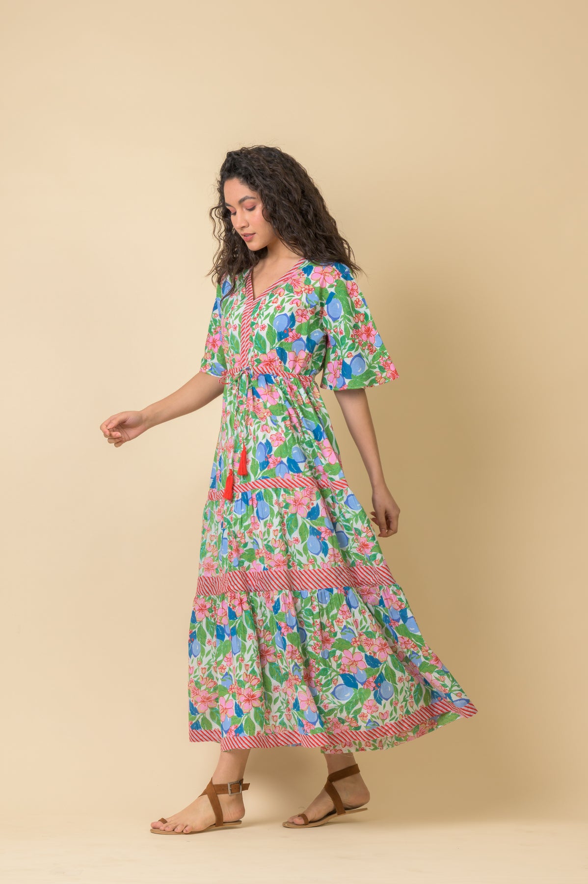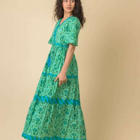 The dress is made using traditional wooden block printing, giving each piece a unique, handcrafted charm.