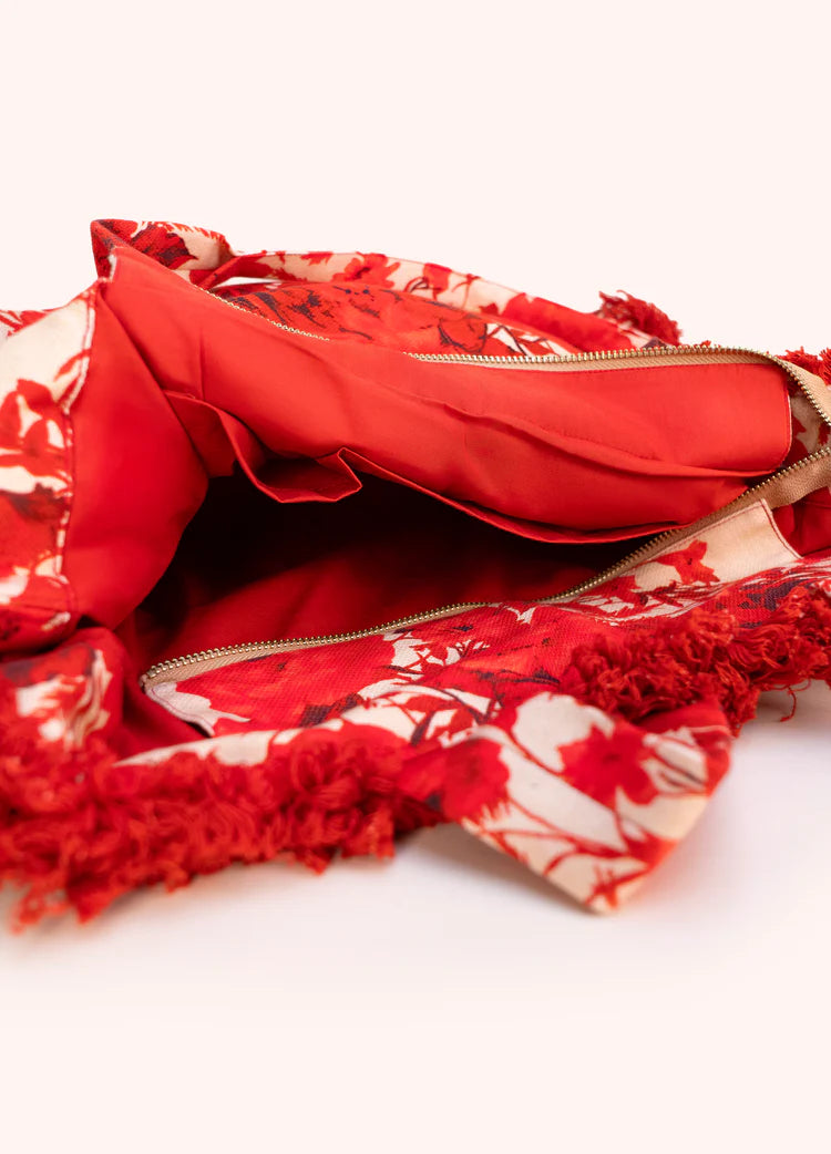 Elevate your everyday style with the SS26 Fringed Box Tote in Rouge Blooms. Its vibrant colors and bold print add a touch of luxury to any outfit. Perfect for pairing with our matching kimono gown or jacket, this timeless tote is a delightful treat for yourself or a loved one.