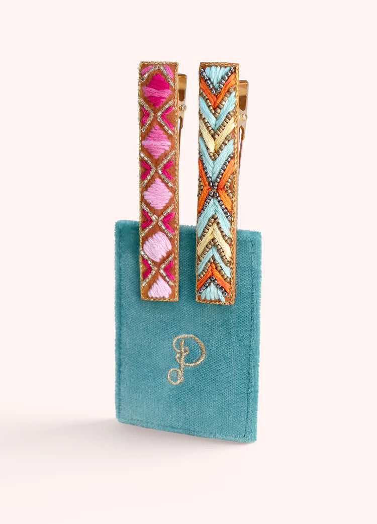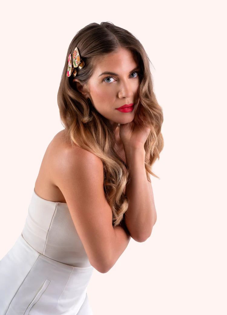 Elevate your style with the SS26 Embellished Hair Bars in Fuchsia/Summer Deco. Perfect for the fashion-forward individual, these handcrafted hair accessories allow for versatile styling—wear them together or separately for a fresh look. Presented on a velvet card, they make a lovely gift or a delightful treat for yourself.