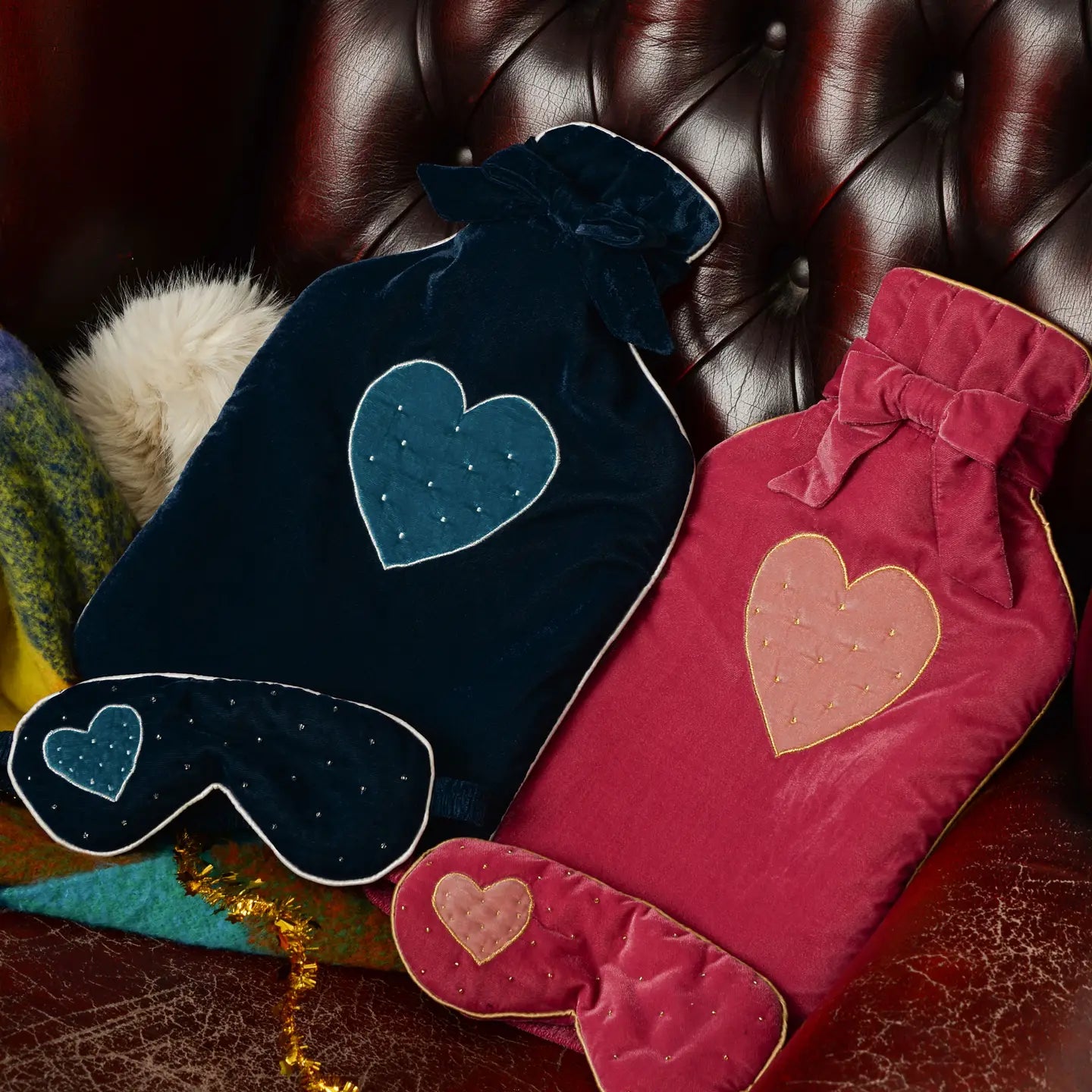 Regular price £30.00Introducing our luxurious blue velvet hot water bottle, adorned with a heart design and silver embroidery. Keep warm and cozy on chilly nights, or gift to a loved one for a touch of elegance. Complete the set with our matching eye mask. Now includes rubber hot water bottle.