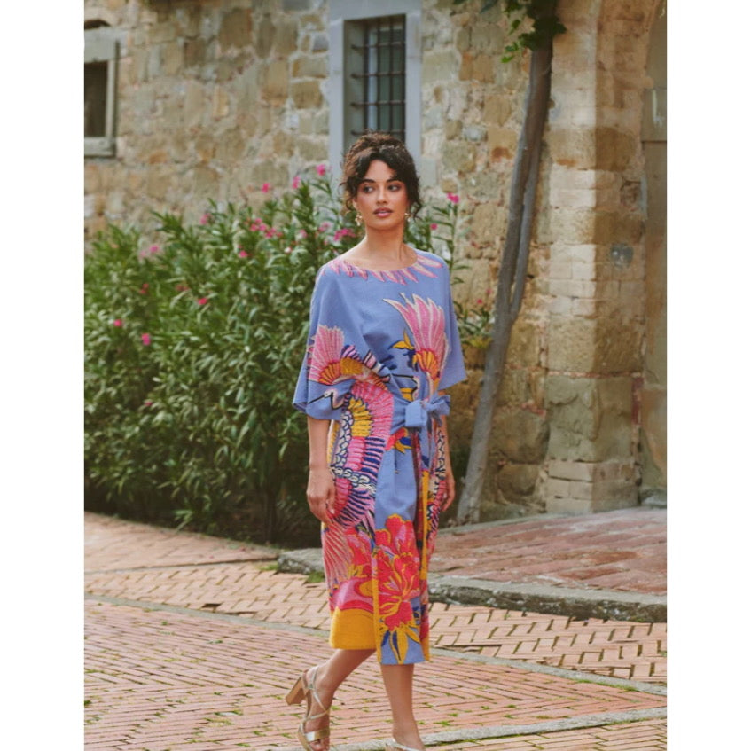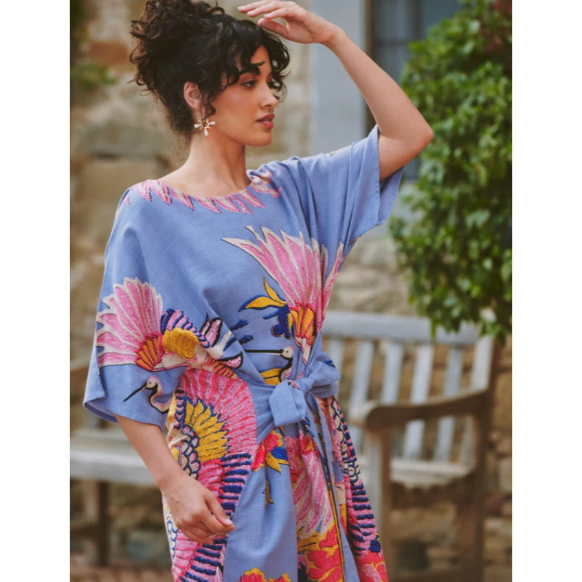 The Crane Periwinkle Obi Dress features a timeless crane print, symbolizing good fortune and longevity. The design showcases large cranes in pink and orange tones against a periwinkle blue background, offering a harmonious and visually appealing aesthetic, suitable for various occasions.