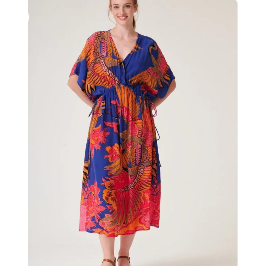 Regular price £110.00The Crane Cobalt String Dress features a vibrant crane pattern in pink and orange on a cobalt blue background, promoting a cheerful aesthetic. Its Grecian design and adjustable drawstring side ties ensure a perfect fit, while the cool crepe fabric offers comfort, making it suitable for many occasions.