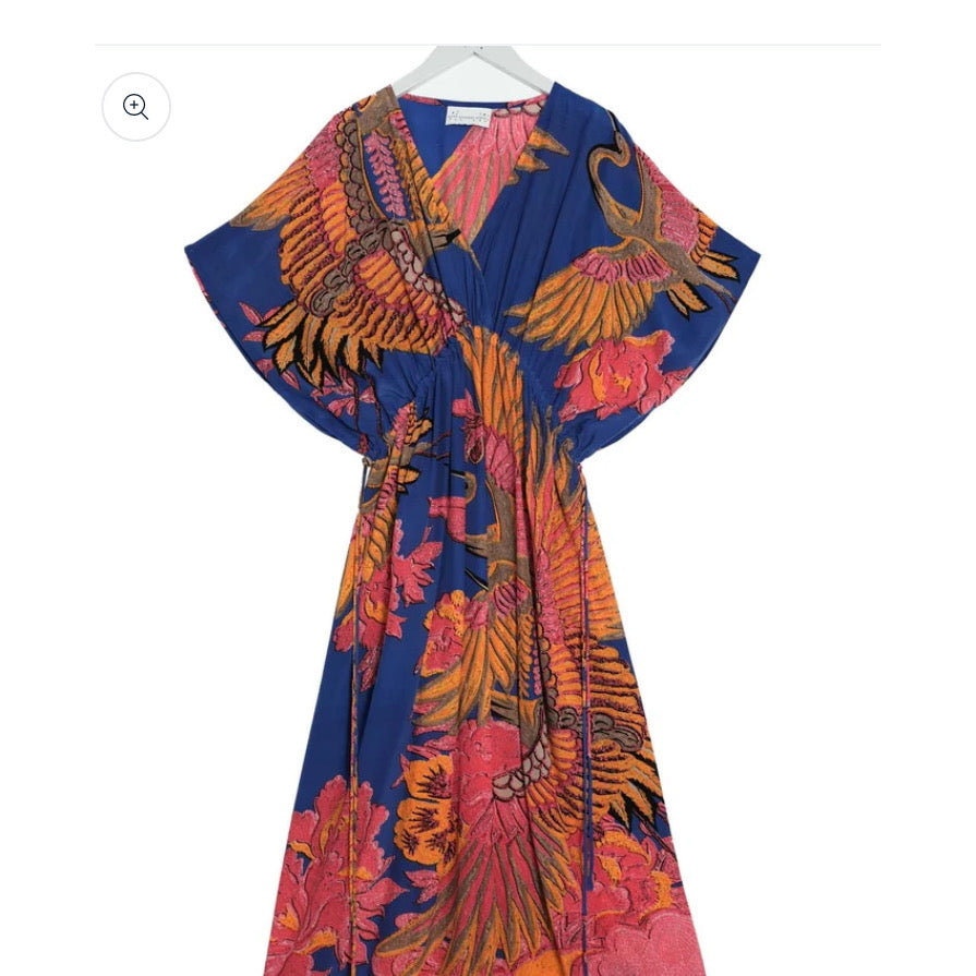 Regular price £105.00The Crane Periwinkle Obi Dress features a timeless crane print, symbolizing good fortune and longevity. The design showcases large cranes in pink and orange tones against a periwinkle blue background, offering a harmonious and visually appealing aesthetic, suitable for various occasions.
