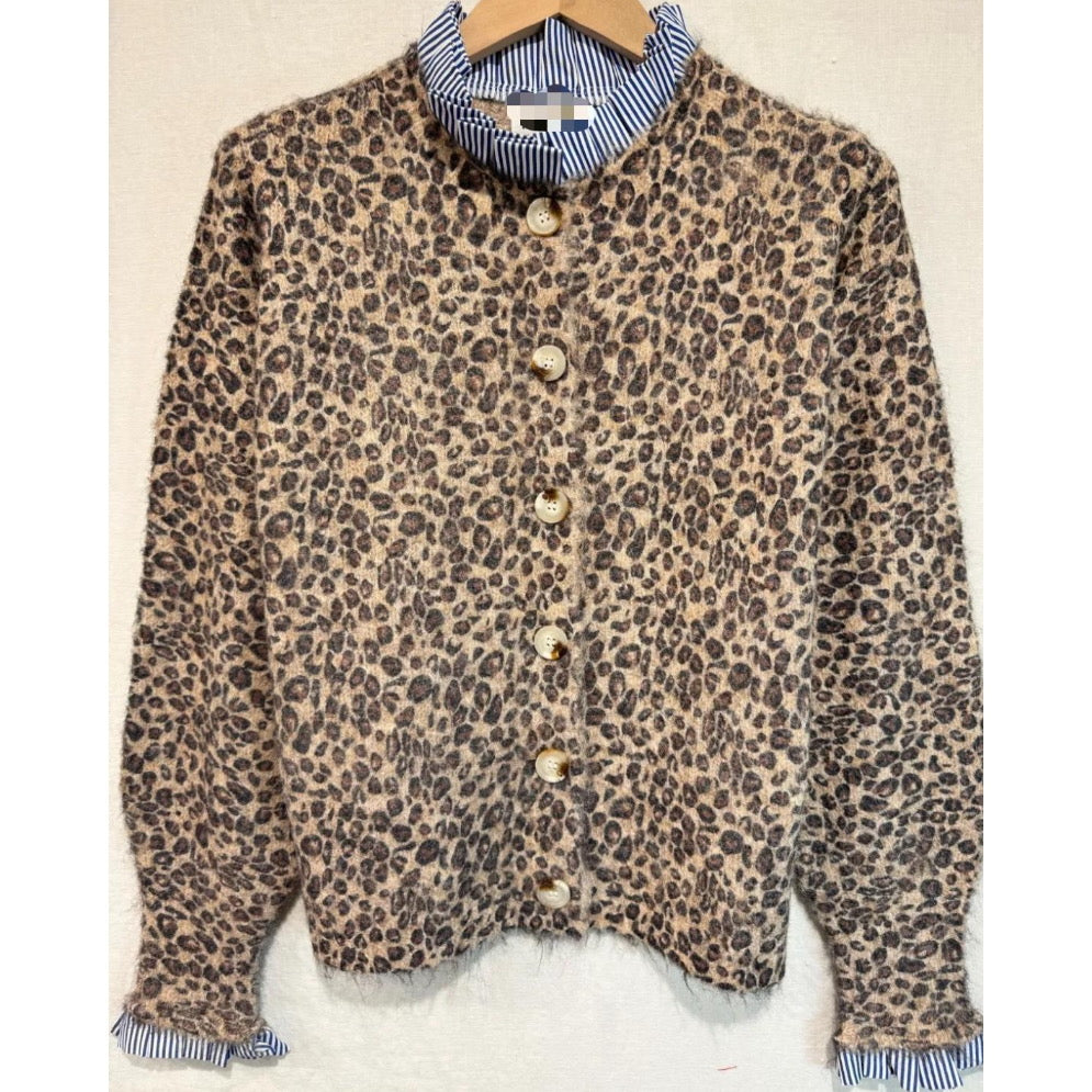 Regular price £59.00The Leo Cardigan with Stripe combines functionality with style, featuring a leopard print design that enhances visual appeal. Its button-through round neck allows for adjustable wear, while the blue and white striped frill at the neck and cuffs adds a unique touch.