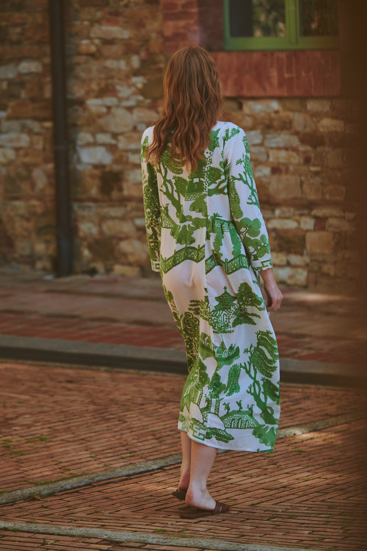The Giant Willow Green Pleat Pinch Dress combines timeless style with comfort. Its classic willow print on an ivory base is perfect for summer outings. Made from 100% organic cotton, the easy V-neck and flowy maxi skirt, complete with pockets, ensure you stay cool and chic while enjoying your day.