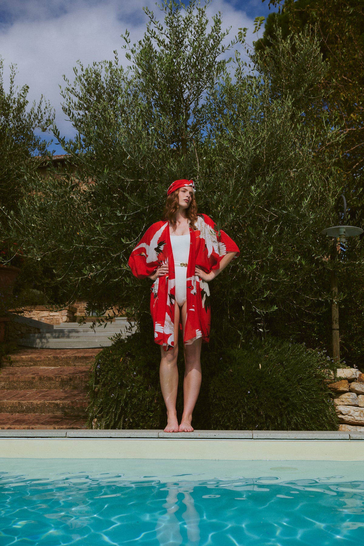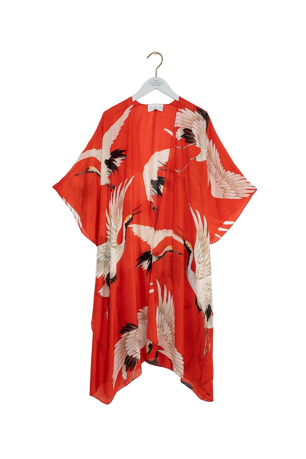 The Stork Scarlet Throwover features a contemporary stork print, aligning with current art deco trends in both fashion and interiors. This lightweight, mid-length design offers an open front and loose arms, making it an ideal cover-up for warmer months or as resort wear for holiday settings.