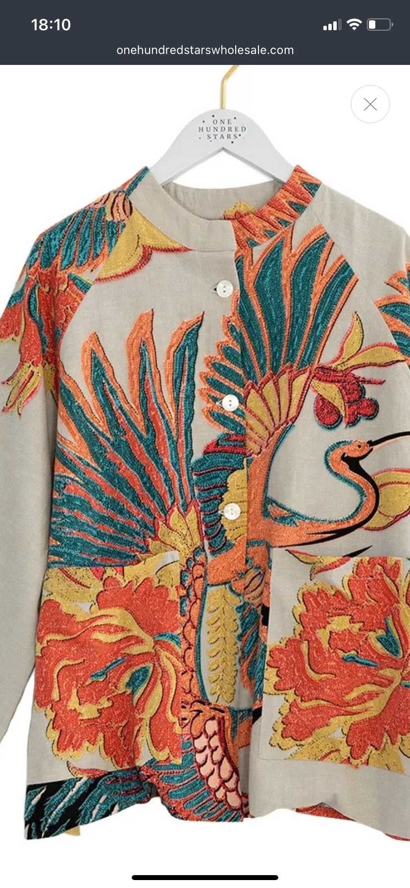 The Crane Stone Summer Jacket features a vibrant crane motif in a blend of green, blue, and orange against a neutral stone background, offering a visually appealing design. Crafted from a breathable cotton-linen mix, it ensures comfort in warm weather. The loose fit with a mandarin collar and ¾ length sleeves promotes ease of movement, making it an ideal choice for summer outings.