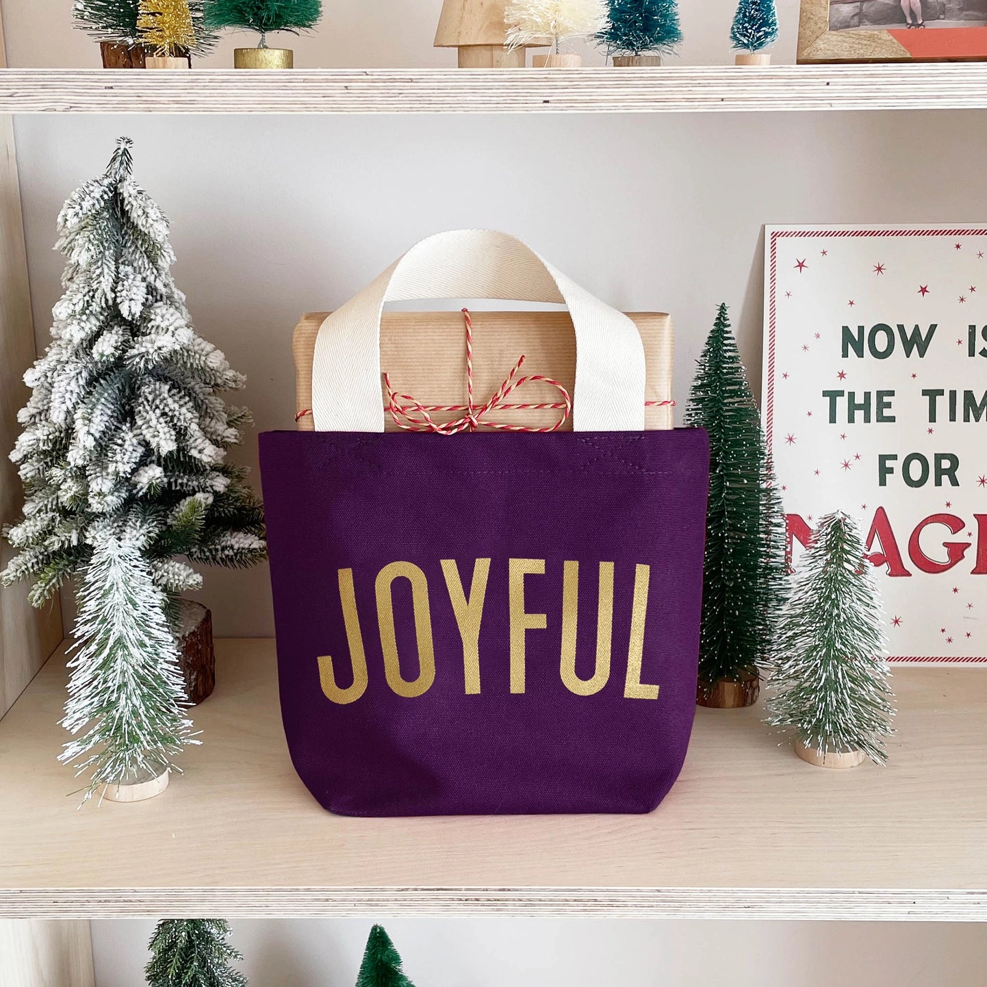 Regular price £19.00Spread holiday cheer with our sweet and sturdy Joyful canvas tote! Perfect for carrying festive goodies, this plum-colored bag is hand-crafted with love in the UK. The metallic gold print adds a touch of charm to this reusable gift bag. It's a must-have for the season of giving.