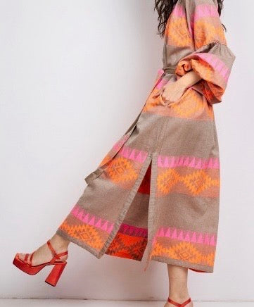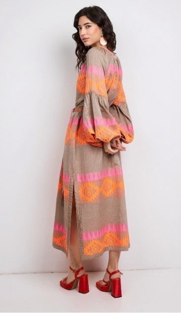 Regular price £79.00The Ethnic Print Maxi Dress is crafted from cotton, featuring a distinctive ethnic print. It includes long sleeves with puff detailing, side slits for ease of movement, and a self-tie belt for a tailored fit. The scoop neck with buttons enhances its elegant design, making it suitable for holidays and warmer days !