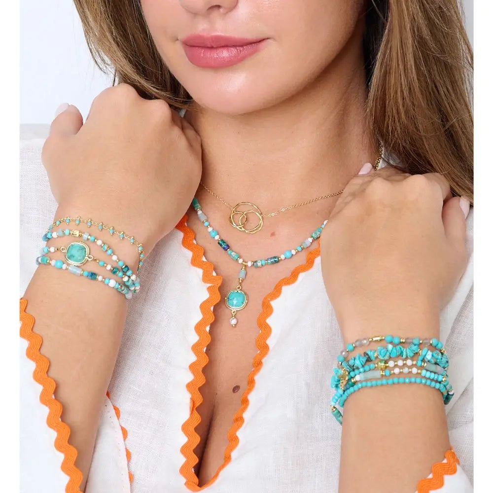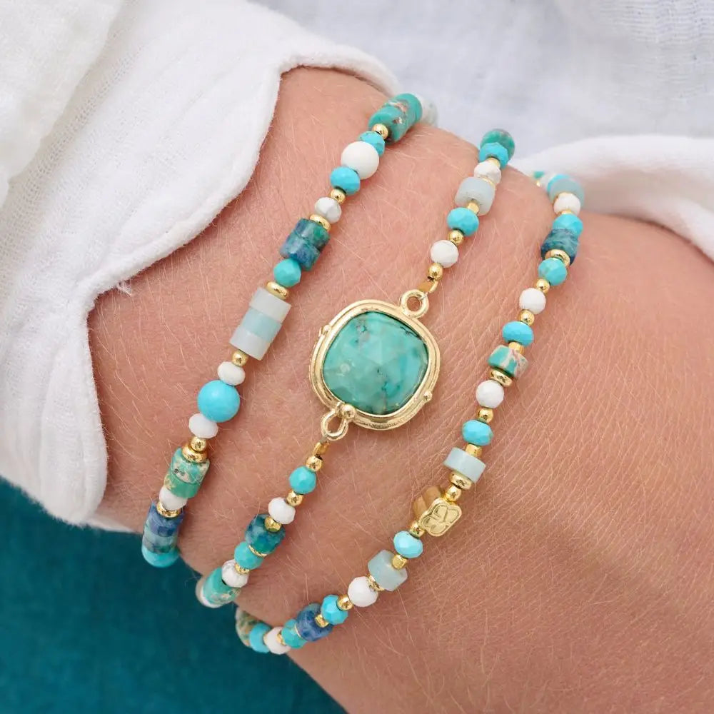 The Adria Acqua Gemstone Bracelet features turquoise-colored gemstones and a striking central blue stone, ideal for summer styling. Its adjustable design, with a silicon slider accommodating most wrists, ensures a comfortable fit. Crafted with a 14k gold plate on brass, it measures up to 26cm in length, offering durability and elegance.