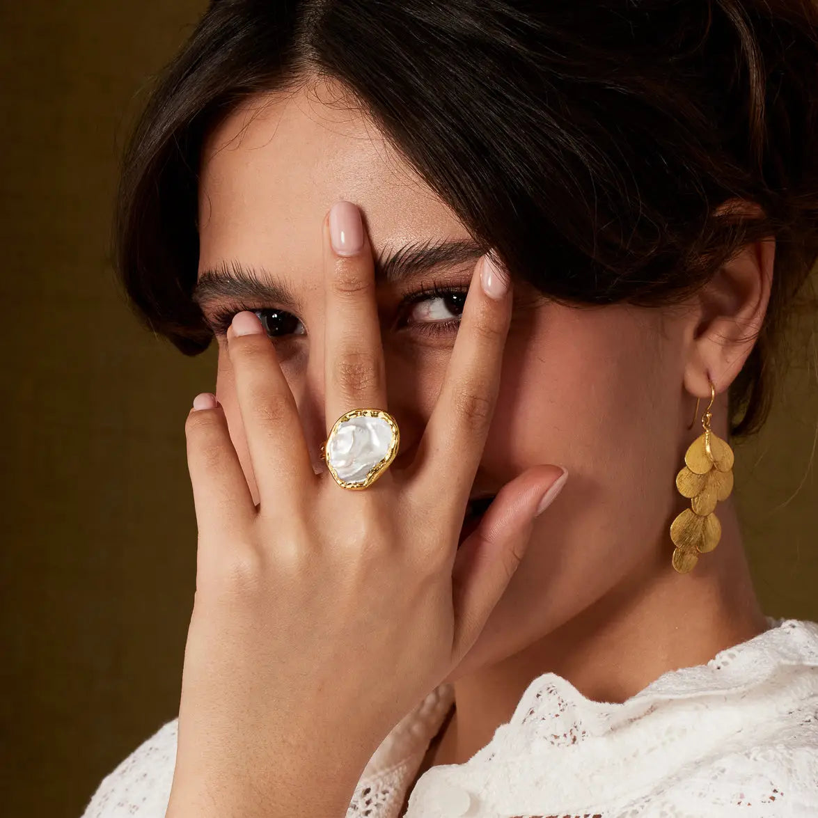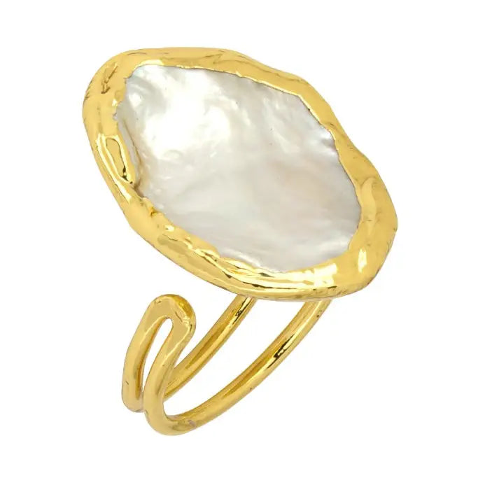 Elevate your style with the Leila Pearl Ring. This adjustable cocktail ring features a stunning flat white freshwater pearl set in a gold-plated band. Its modern design makes it a versatile choice for everyday wear or special occasions, while the unique nature of each pearl adds a personal touch.