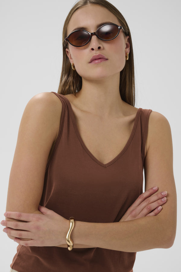 Introducing the SLColumbine Top in Capuccino. With its regular fit and wide straps, this top offers comfortable support for all-day wear. The stylish v-neck design at both the front and back makes it a versatile choice, perfect for layering or wearing on its own. Enjoy a blend of fashion and comfort!