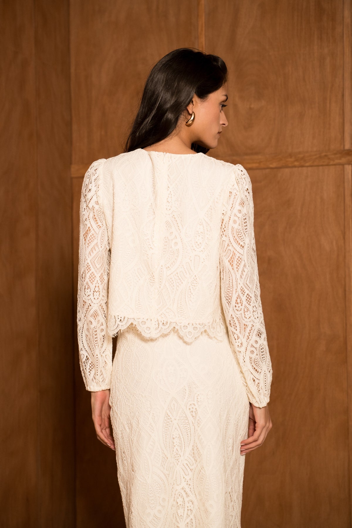 Regular price £49.00The Gracie Lace Top in Ecru features an elegant lace design, complemented by long sleeves and a short length. Its versatile style makes it suitable for many occasions, fabulous co ord with matching Gracie skirt.The breathable fabric ensures comfort while maintaining a polished appearance, enhancing your wardrobe options effectively.