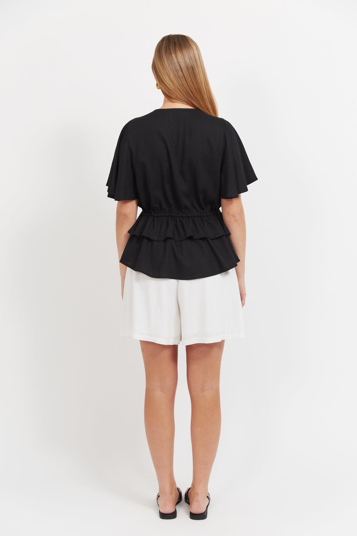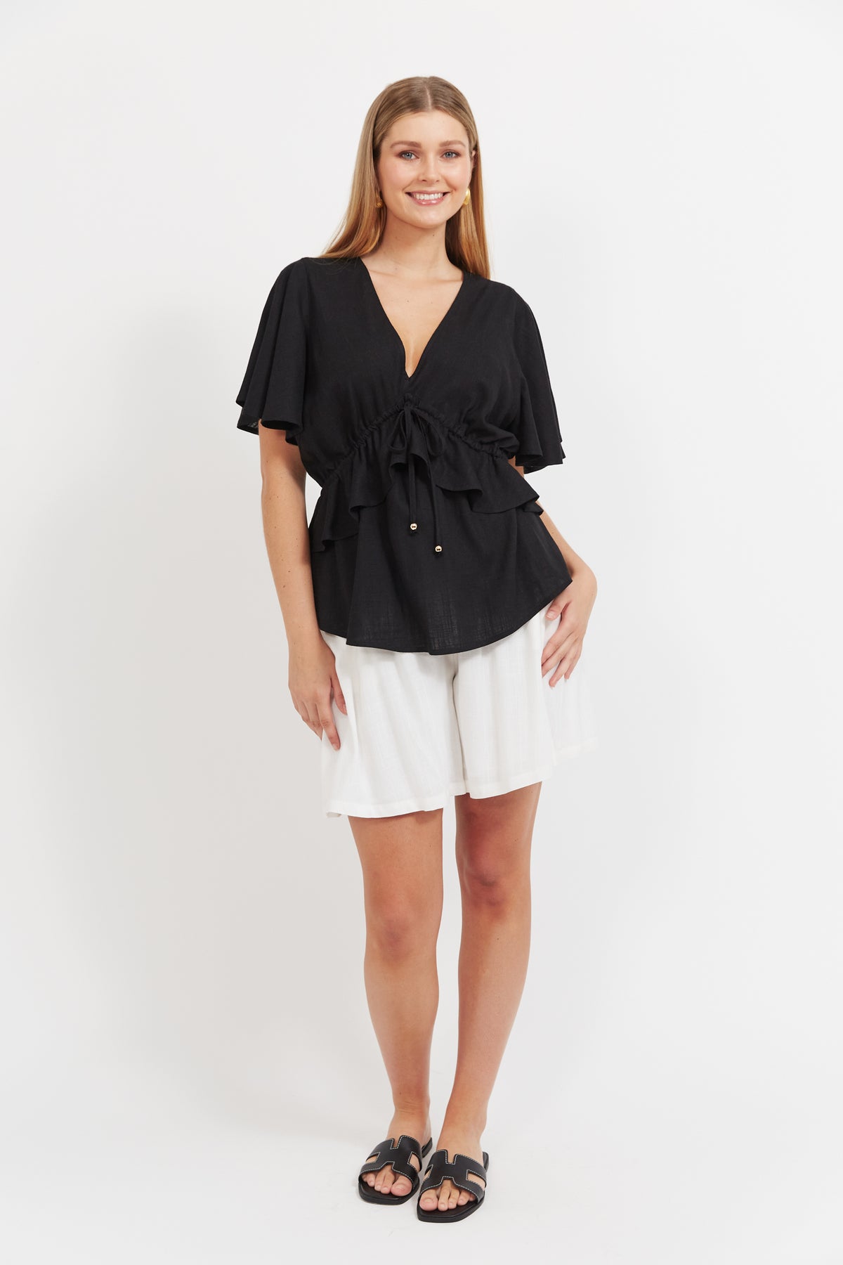Elevate your wardrobe with the Jardin Frill Top in Black. This breathable linen-blend blouse features a flattering V-neckline, charming ruffle details, and adjustable front ties adorned with gold beads. Its relaxed fit and hip-length design make it a versatile choice for any occasion, effortlessly pairing with linen pants, denim or skirts.