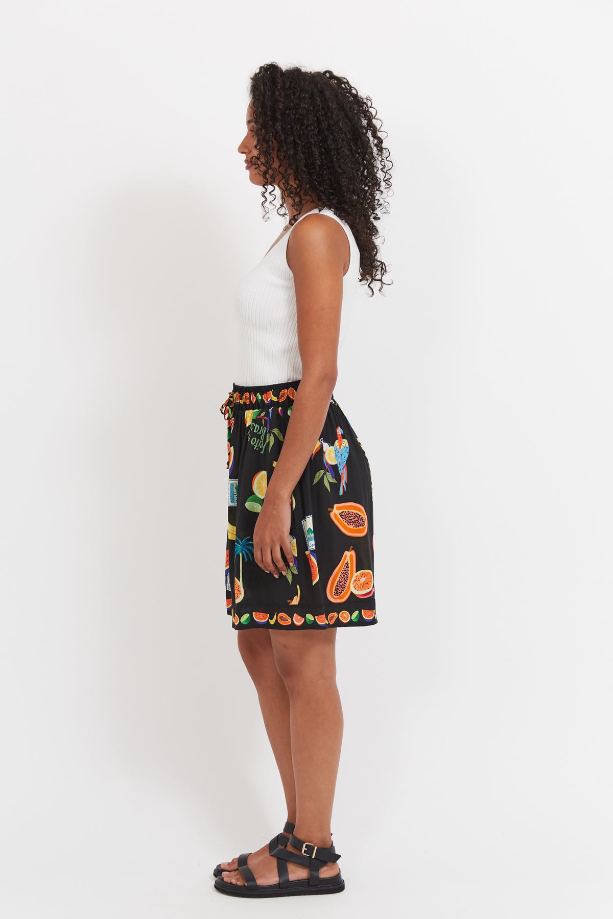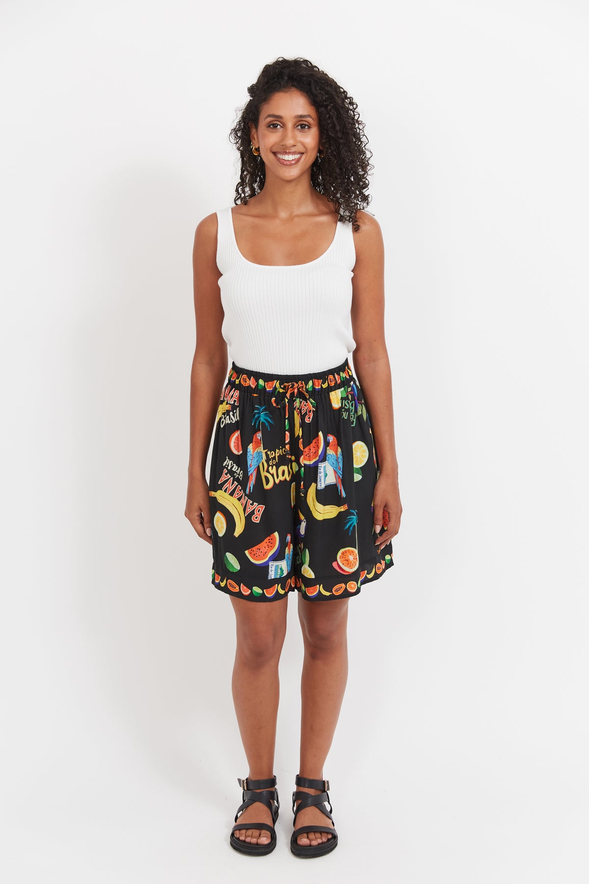Regular price £55.00The Cabana Shorts in Brasil Black feature a vibrant fruit and toucan print, designed for warm climates. The elasticized waistband with a drawstring ensures a comfortable fit, while side pockets enhance practicality. Made from lightweight rayon, these mid-thigh length shorts offer breathability, ideal for leisure activities.